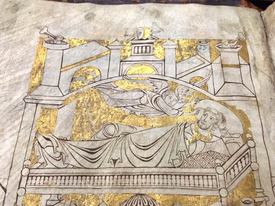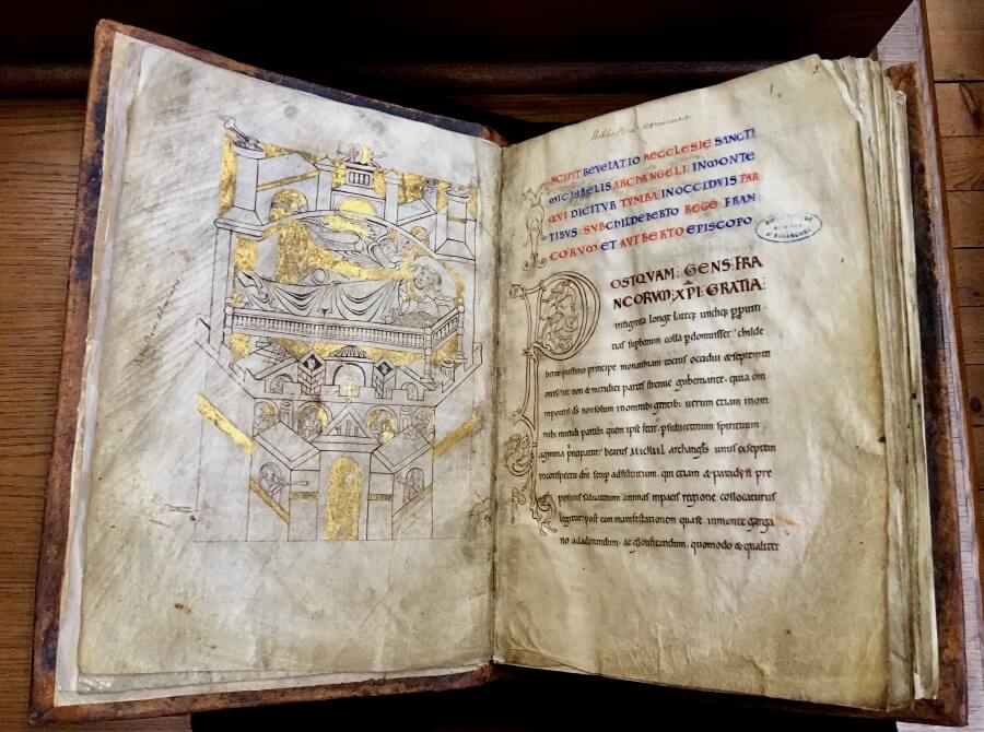 «И по сей день этот манускрипт хранит, среди прочих, упоминание о передаче из Монте-Гаргано реликвий для Мон Сен-Мишеля», — сказал мэр и историк в одном лице, зачитывая для собравшихся записи на латыни. Ценный манускрипт был предоставлен для нашего обозрения, открытый на развороте с изображением «Сна Святого Обера». Эта картинка известна по исследовательским книгам и растиражирована в большинстве изданий про Мон Сен-Мишель.