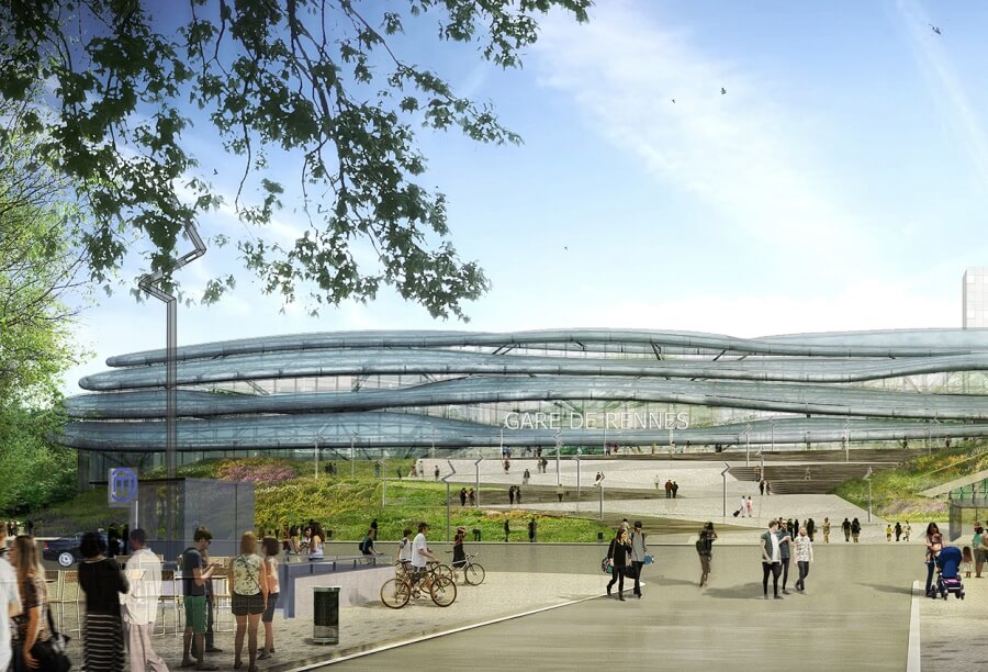 Что же сегодня представляет собой станция LGV в Рене: строительную площадку или объект ландшафтного дизайна? Архитекторы Ferrier, Gazeau et Paillard (FGP), отвечающие за проект, заглянули в своих решениях дальше, чем «конец локомотива». Они замыслили станцию будущего уже не как просто здание, а как встроенный пейзажный объект, выходящий за рамки только функциональности. Новый вокзал Рена (Quartier EuroRennes Gare de Rennes) будет окружен растительным холмом, интегрирующий железнодорожную станцию в пейзаж и жизнь города.