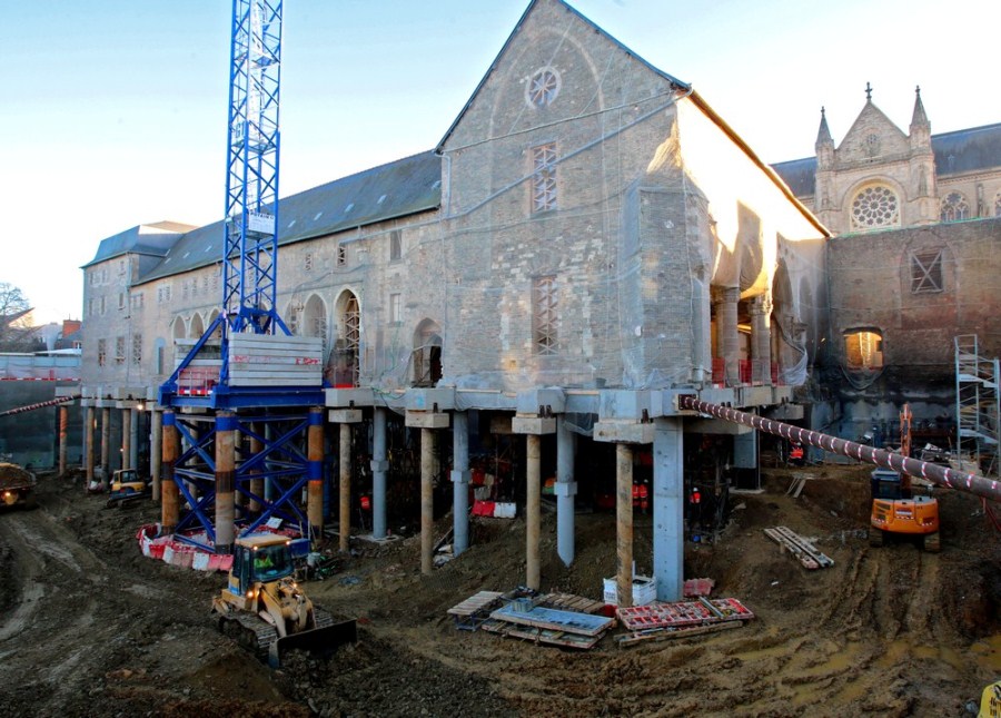 Возглавляемая архитектором Гервилли стройка начинается в феврале 2014 г.; было задействовано 250 рабочих 35 различных профессий: каменщики, сварщики, плотники, кровельщики… Вот только один из этапов жизни строительной площадки: весной 2015 г. монастырь «воспарил». Дабы заложить фундамент большого зрительного зала, был выбран 15-метровый слой грунта под основанием монастыря.