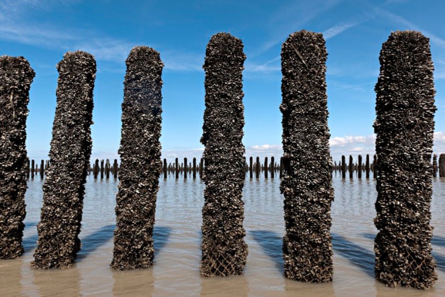Возьмем мидии, которые выращивают в Вивье-сюр-Мер на сваях-бушо, высотой 3,5 м, высаженных в открытое море. Основания свай защищены специальной «юбкой» от песка и вторжения крабов, посему беспокоят наши мидии только приливы и отливы да фермеры, что зорко следят за ними, прежде чем их собирать.