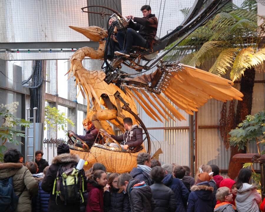 Под самую крышу ангара поднимается цапля на 3-х метровых крыльях (если пожелаете — с вами)))… Все эти механизмы являются прототипами еще одного масштабного проекта «Дерево Цапель» (L’Arbre aux Herons), открытие которого планируется в 2021 году. Как оная незаурядная механика рождается в руках конструкторов Компании La Machine, всем предлагают увидеть в мастерских-ateliers, где на глазах у посетителей эти чудеса техники создаются руками мастеров и волонтеров.